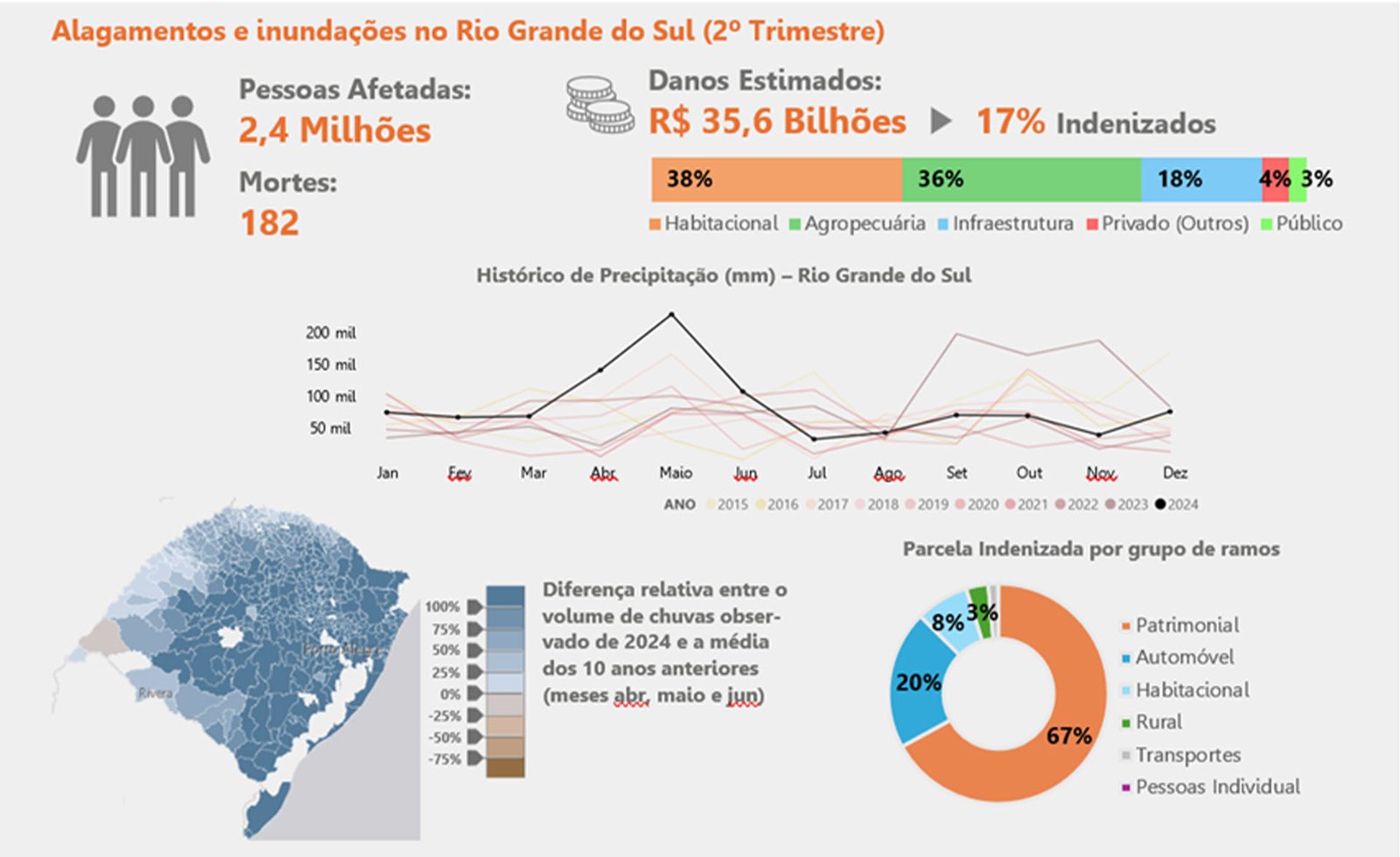 O caso mais emblemático ocorreu em 2024, no Rio Grande do Sul, quando o país registrou o desastre climático mais severo de sua história: 2,4 milhões de pessoas afetadas, 182 mortes e R$ 35,6 bilhões em perdas diretas.