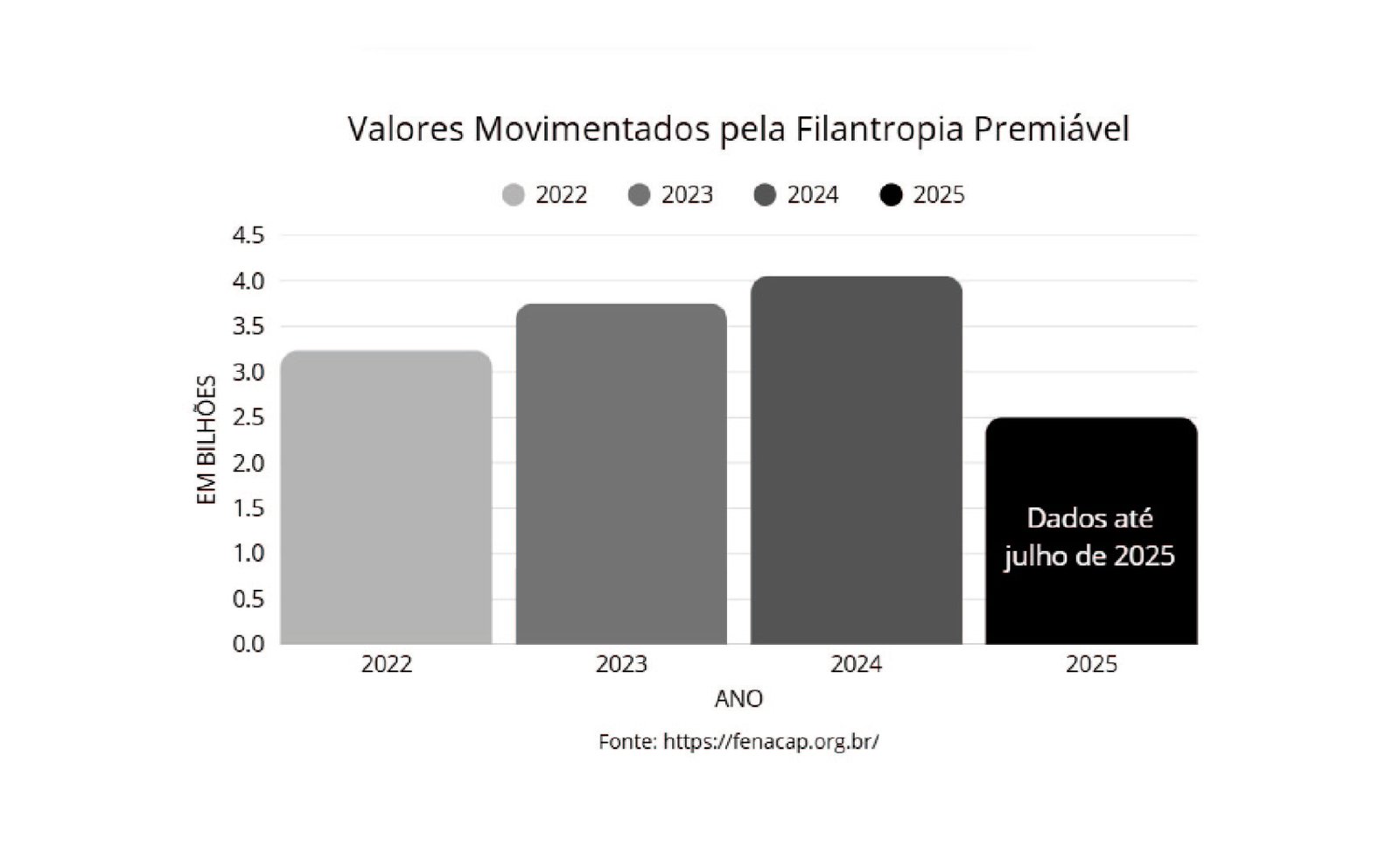 Dados da FenaCap (Federação Nacional de Capitalização) mostram que o segmento vem registrando um crescimento contínuo e expressivo: no ano de 2022 movimentou R$ 3,23 bilhões; em 2023 saltou para R$ 3,75 bilhões; em 2024 ultrapassou a marca de R$ 4 bilhões ao atingir R$ 4,05 bilhões; e, até julho de 2025, já acumulava R$ 2,5 bilhões.