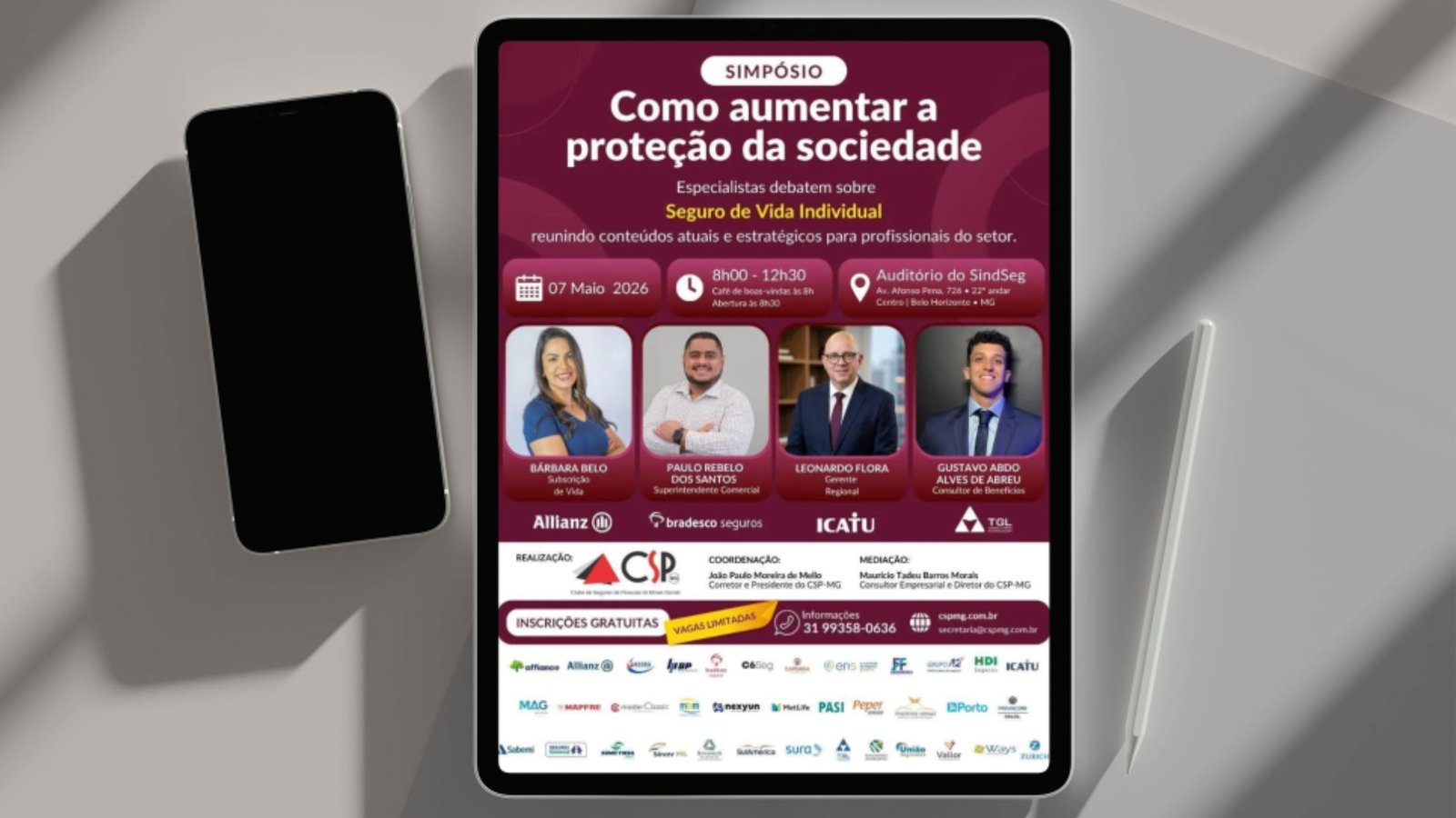 O simpósio reunirá especialistas para discutir temas estratégicos e atuais do segmento, promovendo a troca de experiências e a atualização dos profissionais do mercado. Participam desta edição a especialista Bárbara Belo, da área de Subscrição de Vida da Allianz; o superintendente comercial da Bradesco Seguros, Paulo Rebelo dos Santos; o gerente regional da Icatu Seguros, Leonardo Flora; e o consultor de benefícios da TGL Consultoria Financeira, Gustavo Abdo Alves de Abreu.
