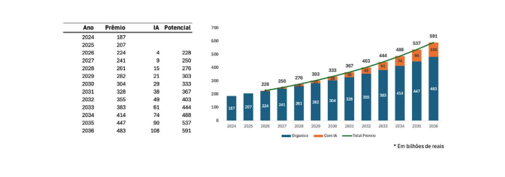 Eu transformei esse ganho em uma produção global adicional de 2% em prêmios emitidos ao longo dos próximos 10 anos, o que chamei de “efeito IA”.